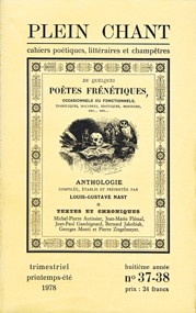 Plein Chant cahiers poétiques, littéraires et champêtres De quelques Poètes frénétiques, occasionnels ou fonctionnels, diaboliques, macabres, érotiques, morbides, etc… etc… Anthologie compilée, établie et présentée par Louis-Gustave Nast Textes et chroniques Michel-Pierre Autissier, Jean-Marie Flémal, Jean-Paul Gaschignard, Bernard Jakobiak, Georges Monti et Pierre Ziegelmeyer. |